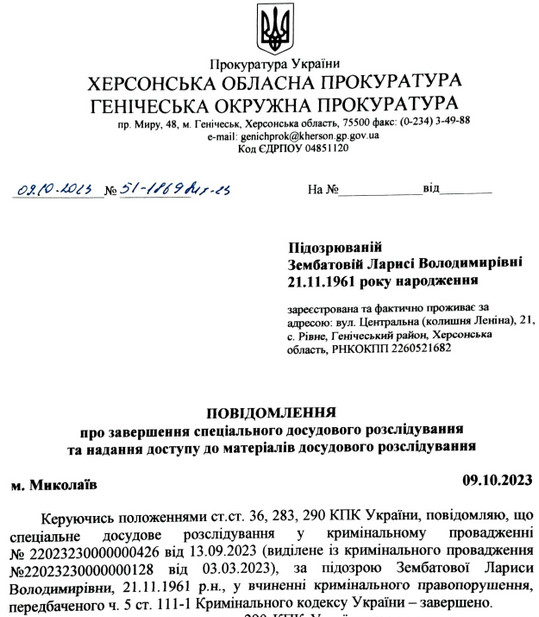 Зембатовій інкримінували колабораціонізм. Вона пішла на співпрацю з росіянами не пізніше червня 2022 року.