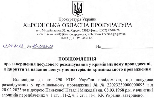 Паньковій інкримінували пособництво державі-агресору та колабораціонізм. Вона пішла на співпрацю з росіянами 19 липня 2022 року.