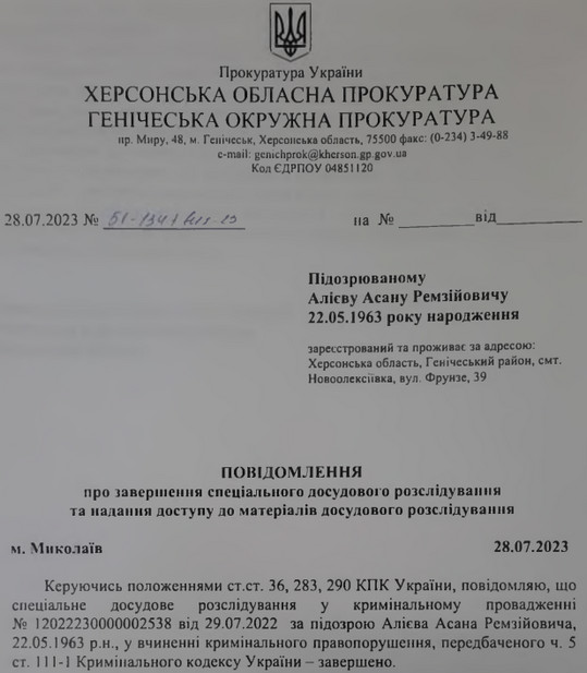 Алієву інкримінували колабораціонізм. Він пішов на співпрацю з росіянами у другій декаді травня 2022 року.