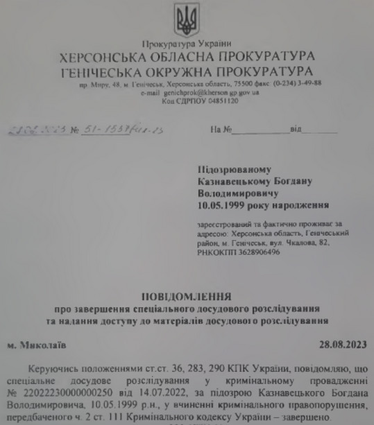 Казнавецькому інкримінували державну зраду, яка скоєна в умовах воєнного стану. Він пішов на співпрацю з росіянами не пізніше квітня 2022 року.