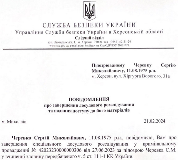 СБУ завершила розслідування щодо херсонського колаборанта Сергія Черевка