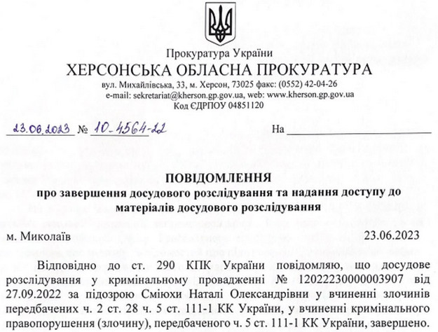 Сміюсі інкримінували колабораціонізм. Вона пішла на співпрацю з росіянами не пізніше кінця серпня 2022 року.