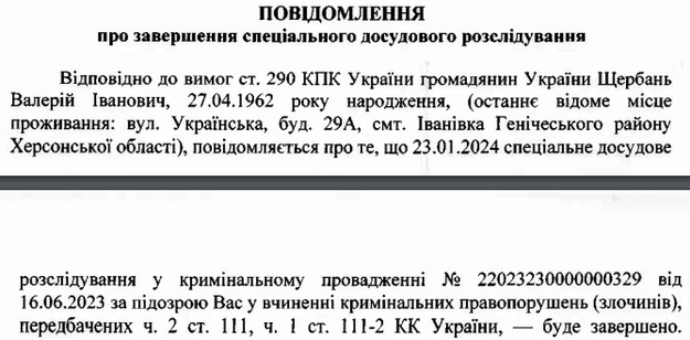 Щербаню інкримінували пособництво державі-агресору та державну зраду, яка скоєна в умовах воєнного стану.