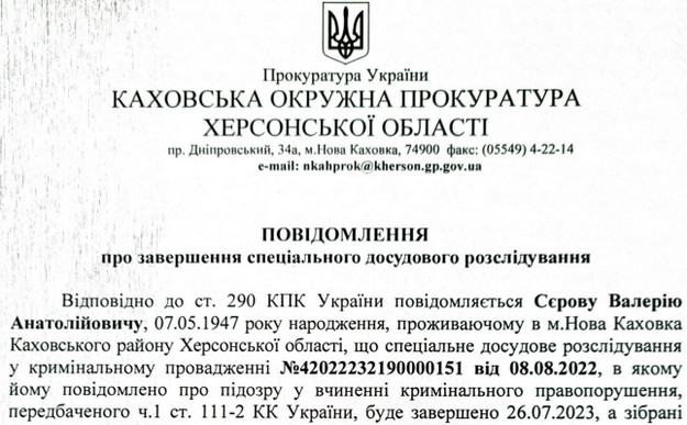 Сєрову інкримінували пособництву державі-агресору. Він пішов на співпрацю з росіянами не пізніше березня 2022 року.