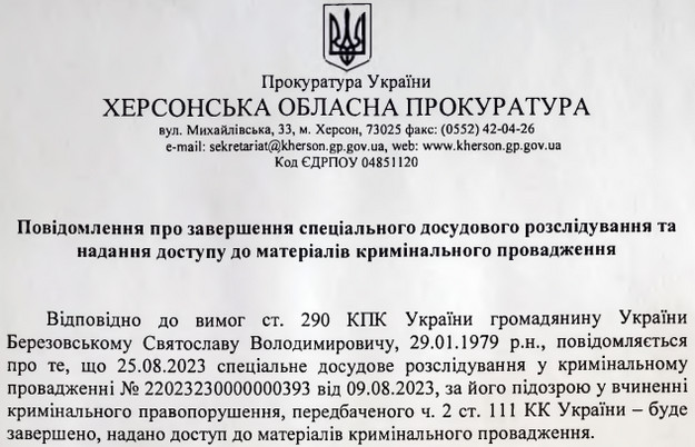 Березовському інкримінували державну зраду, яка скоєна в умовах воєнного стану. Він пішов на співпрацю з росіянами не пізніше березня 2022 року.