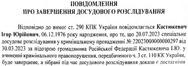 Кастюкевичу інкримінували посягання на територіальну цілісність і недоторканність України. Його залучили до реалізації плану з російської анексії Херсонщини.