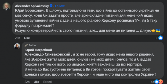 Юрій Погрібний, депутат Херсонської міської ради V скликання (партія “Віче” , екс-секретар Херсонської міської ради (2006-2010), заявив на своїй сторінці у соціальній мережі Facebook в коментарях щодо зупинення війни під час дискусії з ректором Херсонського державного університету, екс-народним депутатом Співаковським Олександром Володимировичем, “я ж не герой, тому якщо нема іншого рішення, яке збереже життя моїх дітей, онуків і не моїх дітей і онуків, то я б віддав Херсон і не тільки його. Бо людські життя важливіші за всі теріторії. В мене до Вас зустрічне питання: а Ви готові пожертвувати життям своєї доньки і онуки, щоб зберегти Херсон чи інше місто під контролем України?“.