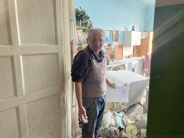 Цей будинок під обстрілом військових РФ вчетверте, говорить їх сусід Володимир Соколенко."Особисто моя квартира постраждала тричі. Коли перший приліт був, потім другий приліт був в аптеку, а потім третій приліт був у "Ніку", то мені балконні двері поламало. І ці вхідні двері поламало", — розповів він.