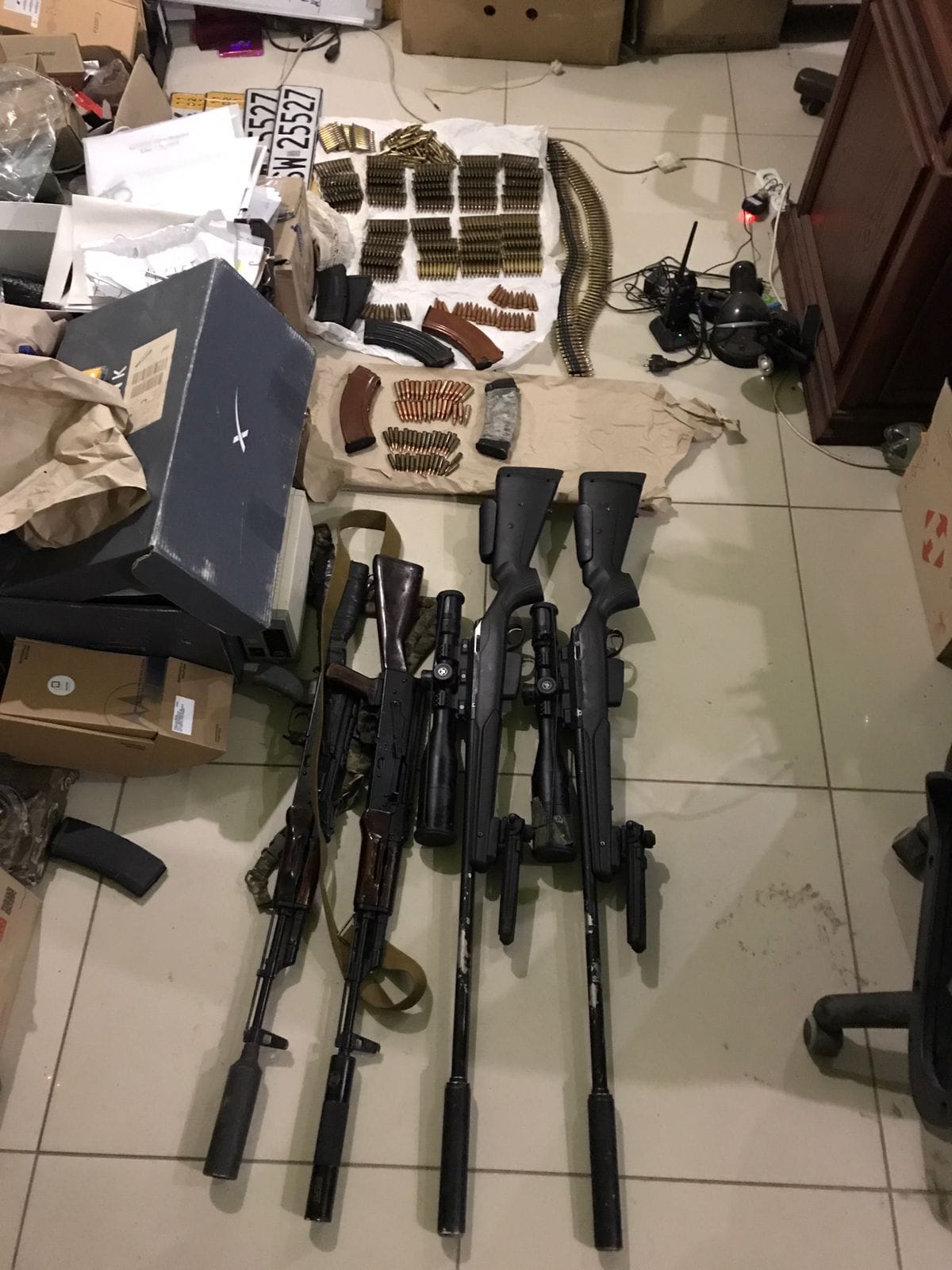 Під час обшуків у фігурантів вилучено сім одиниць автоматичної зброї, дві одиниці нарізної, вісім гранат, гранатомет, два артилерійських снаряди 30 калібру, сім одиниць холодної зброї, понад 3500 набоїв різного калібру, засоби зв'язку, техніка, чорнові записи, документи, два транспортні засоби, на яких переміщувалися учасники групи, а також викрадене майно потерпілих.