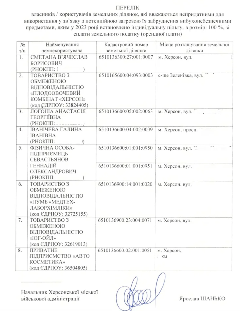 Ще ряд ФОПів та компаній із Херсонської громади звільнили від сплати податку за землю у 2023 році