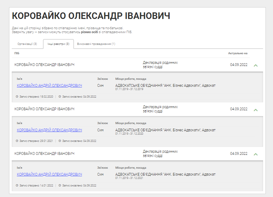 Син голови Херсонського апеляційного суду, Андрій Коровайко, працює в одеській юридичній компанії “АНК. Бізнес Адвокати”.