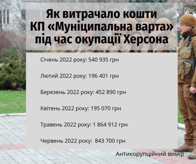 В окупаційному 2022 році витрати «Муніципальної варти» становили 4 мільйони 093 тисячі гривень. Видатки підприємства тривали від початку року і до червня включно: до тих пір, поки до полону не потрапили очільник підприємства та міський голова.