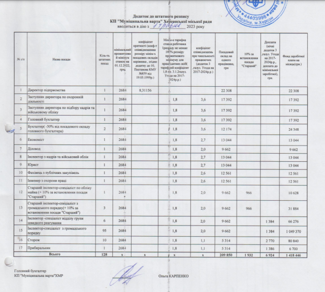 Штатний розпис КП «Муніципальна варта» на 2023 рік виглядає так: