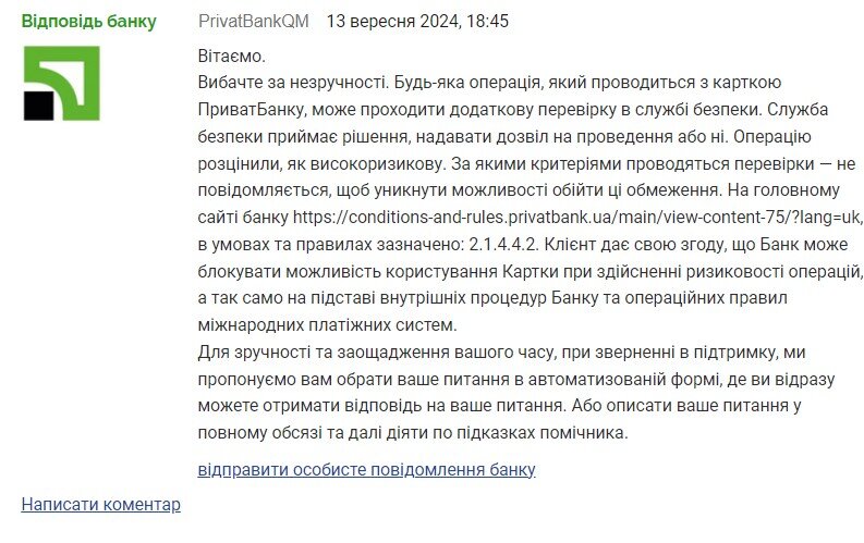 "Служба безпеки приймає рішення, надавати дозвіл на проведення чи ні. Операцію розцінили як високоризикову. За якими критеріями проводяться перевірки - не повідомляється, щоб уникнути можливості обійти ці обмеження. На головному сайті банку, в умовах та правилах зазначено: 2.1.4.4.2. Клієнт дає свою згоду, що Банк може блокувати можливість користування Карткою при здійсненні ризику операцій, а також на підставі внутрішніх процедур Банку та операційних правил міжнародних платіжних систем. в автоматизованій формі, де ви одразу можете отримати відповідь на ваше запитання. Або описати ваші питання у повному обсязі і далі діяти за підказками помічника", - йдеться у повідомленні.