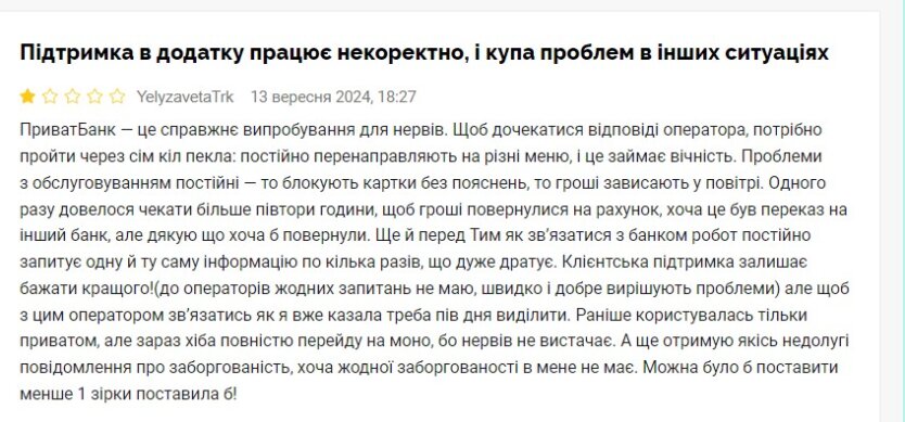 "Одного разу довелося чекати більше півтори години, щоб гроші повернулися на рахунок, хоча це був переказ на інший банк, але спасибі що хоча б повернули. Ще перед тим як зв'язатися з банком робот постійно запитує одну і ту ж інформацію по кілька разів, що дуже дратує. Клієнтська підтримка залишає бажати кращого! (До операторів жодних питань немає, швидко і добре вирішують проблеми) але щоб із цим оператором зв'язатися, як я вже говорила, треба пів дня виділити. Раніше користувалась лише приватом, але зараз хіба повністю перейду на моно, бо нервів не вистачає. А ще отримую якісь безглузді повідомлення про заборгованість, хоча жодної заборгованості в мене немає. Можна було б поставити менше 1 зірки!", - додала клієнтка.