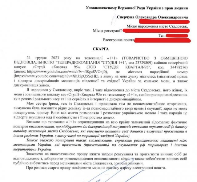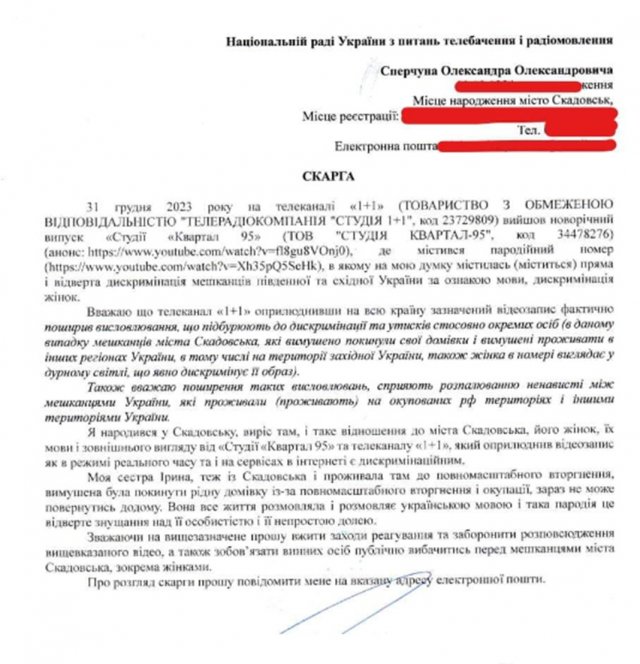 Резонанс навколо номера про Скадовськ у новорічному випуску «Студії «Квартал 95», який вийшов на телеканалі «1+1», не вщухає. Заборонити розповсюдження відео з пародією на скадовчанку та публічно вибачитися перед містинами, зокрема, жінками, вимагає уродженець Скадовська Олександр Сперчун. Він відправив дві скарги, а саме - до Національної ради України з питань телебачення та радіомовлення та Уповноваженому Верховної ради України з прав людини. Чоловік обурений згаданим відеоконтентом і вбачає в ньому дискримінацію мешканців південної та східної України за мовною ознакою, а також дискримінацію жінок.