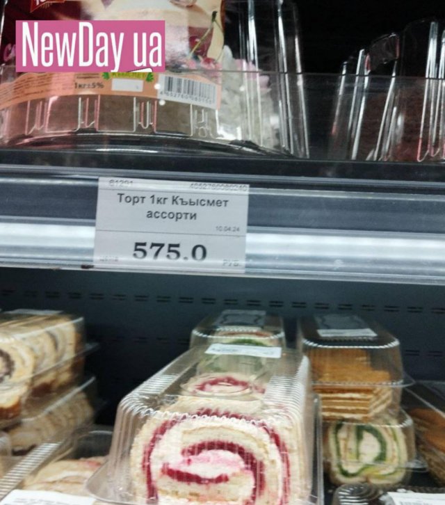 У супермаркеті Family Market, розміщеному напроти багатостраждальної школи № 3 у мікрорайоні міста, навіть «Київський» кримського виробництва можна купити. Коштує він, як і «Сирно-ягідний», 750 руб/кг. Торт «Къысмет» (з кримськотатарської - «Удача») зі смородиною продають по 575 руб/кг. Кілограмовий «Бісквіт Корекс» з шоколадом і малиновим прошарком коштує 674 руб/кг. Кілограмовий торт «Марія» вартує 750, півкілограмовий -465 рублів.