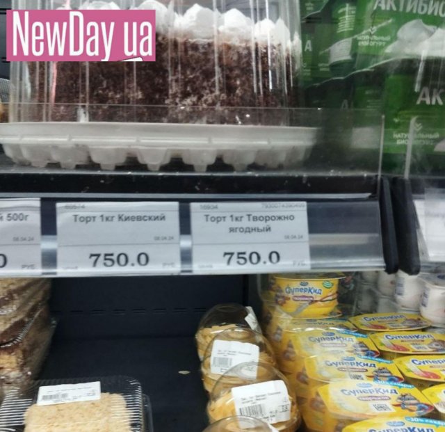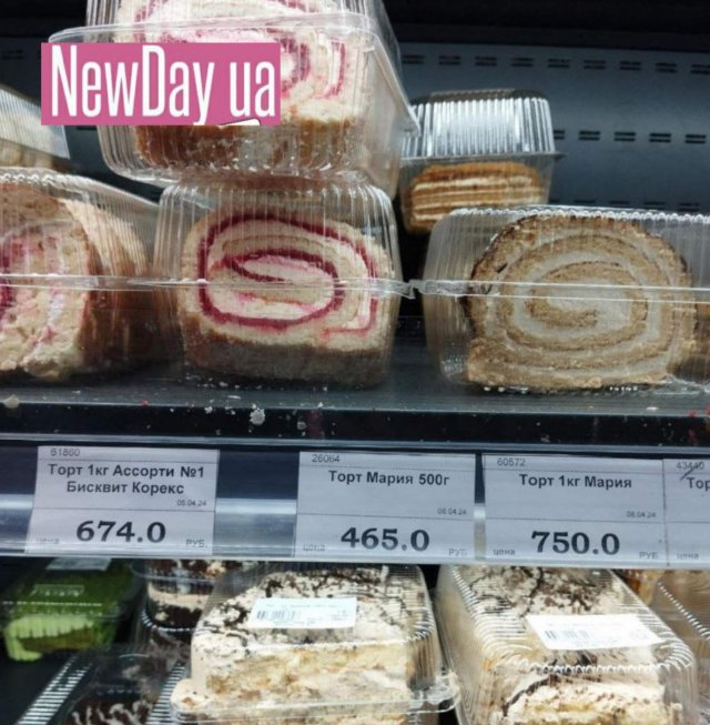 Торти, привезені з тимчасово окупованого Криму, у продуктових крамницях, у середньому, коштують 1600 - 1800 рублів за 1,5 0 2 кг, 700 - 800 рублів за кілограмовий, 400 рублів - за 0,5 кг.