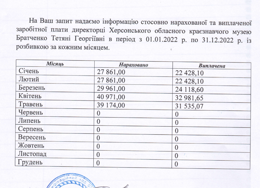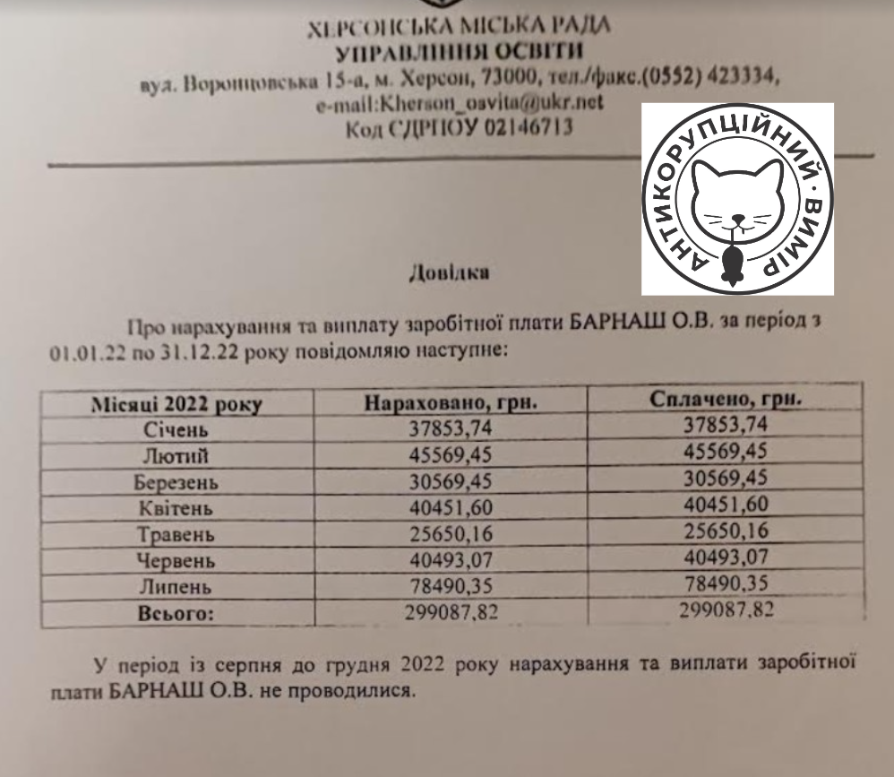 Зарплату з херсонського бюджету вона отримувала при цьому до серпня включно. Загалом їй нарахували 235 408,90 грн (тобто на руки вона отримала приблизно 80% від цих сум):