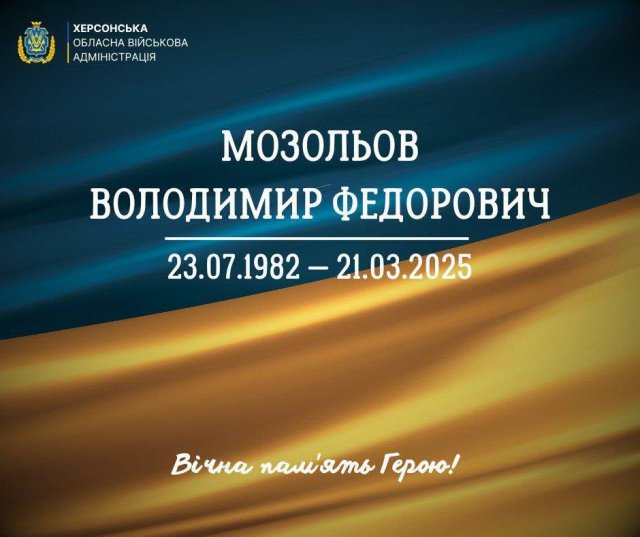 Сьогодні Херсонщина прощається з відважними Героями, які загинули за нашу свободу.Як повідлмила Херсонська ОВА, життя головного сержанта Володимира Мозольова обірвалось під час виконання бойового завдання на Херсонщині. Воїну назавжди 42 роки...