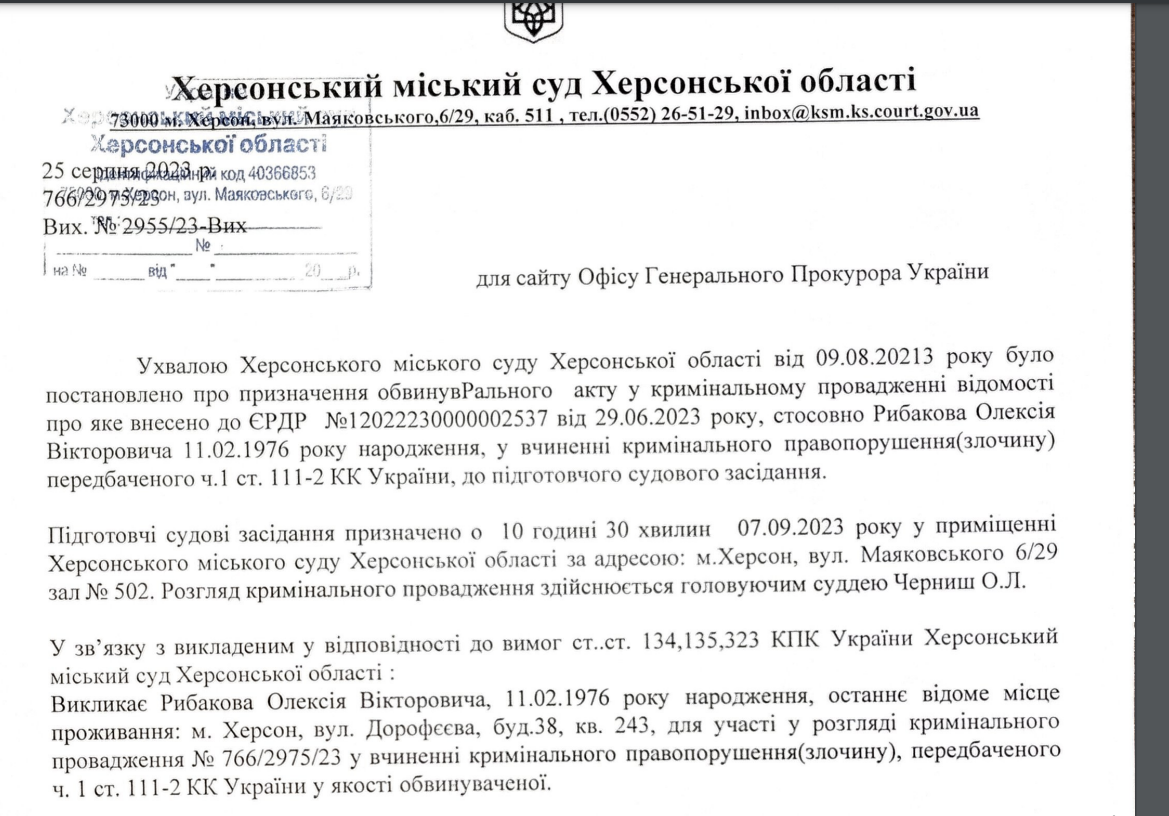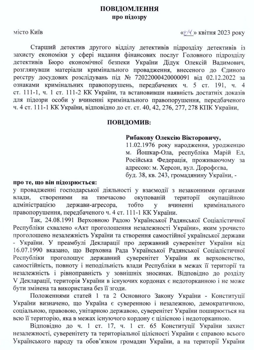 Підозру Олексію Рибакову оголосили у квітні 2023 року. Експосадовець виконавчого комітету міської ради під час окупації Херсона «очолив» так зване «Державне унітарне підприємство Херсон Тепломережі», створене окупаційною ВЦА.