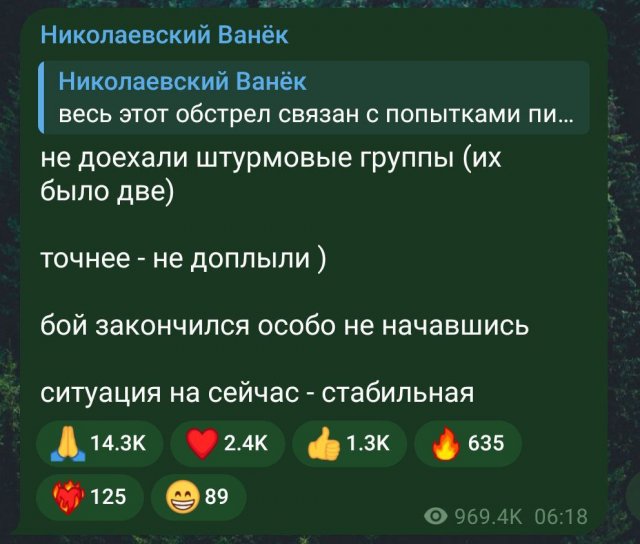 "Не доїхали штуромові групи (їх було дві). Вірніше не доплили. Бій скінчився особливо не ропочавшись. Ситуація на зараз — стабільна", — пише Ваньок.