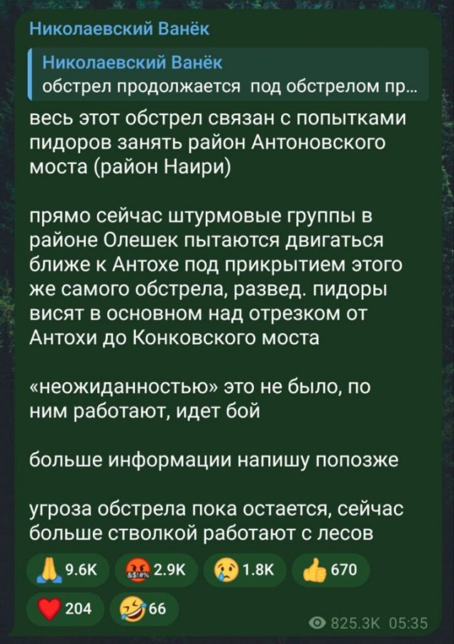 Масований обстріл Херсону та прилеглих населених пунктів мав на меті забезпечити прорив росіян з лівого на правий берез Дніпра в районі Антонівського мосту.Про подробиці сьогоднішніх бойових дій в районі Херсону повідомив поінформований та пов’язаний із ЗСУ телеграм-канал «Миколаївський Ваньок», інформує Акцент.