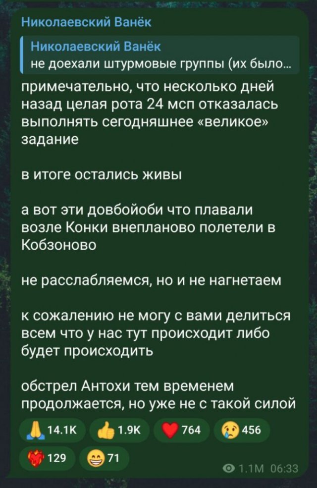 Також блогер повідомляє, що кілька днів тому ціла рота росіян відмовилась від виконання поідбного завдання. Врешті вони залишились живі.