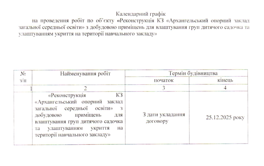 З укладеного договору відомо, що ТОВ “Інвест-Монтажбуд” має відновити приміщення старшої та молодшої школи, добудувати до будівлі школи приміщення для облаштування дитячого садка та побудувати на території освітнього закладу укриття.