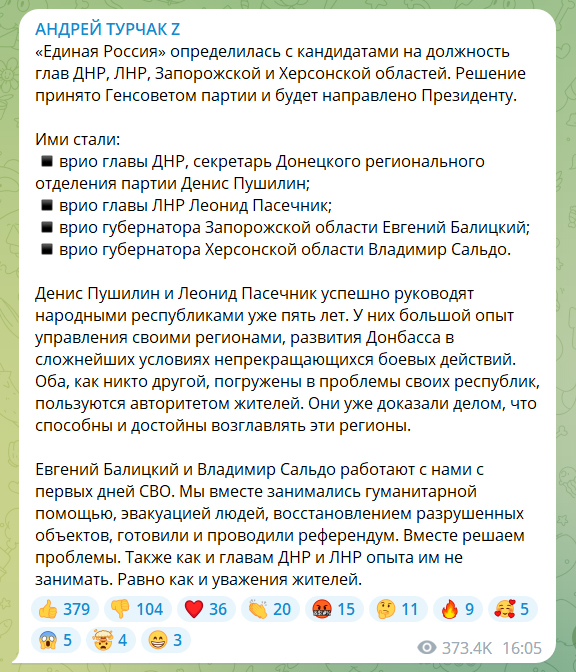 В повідомленні йдеться, що партія зробила своїми кандидатами теперішніх повністю підконтрольних Кремлю голів окупаційної влади так званих «нових територій». Щодо окупованої частини півдня України, то це – Володимир Сальдо (Херсонська область) і Євген Балицький (Запорізька область).