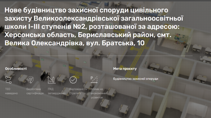 Планується нове будівництво захисної споруди цивільного захисту Великоолександрівської загальноосвітньої школи І-ІІІ ступенів №2. Проєкт належить до програми комплексного відновлення Херсонської області та реалізується за розпорядженням №873 від 19.12.23 начальника Херсонської ОВА Олександра Прокудіна.