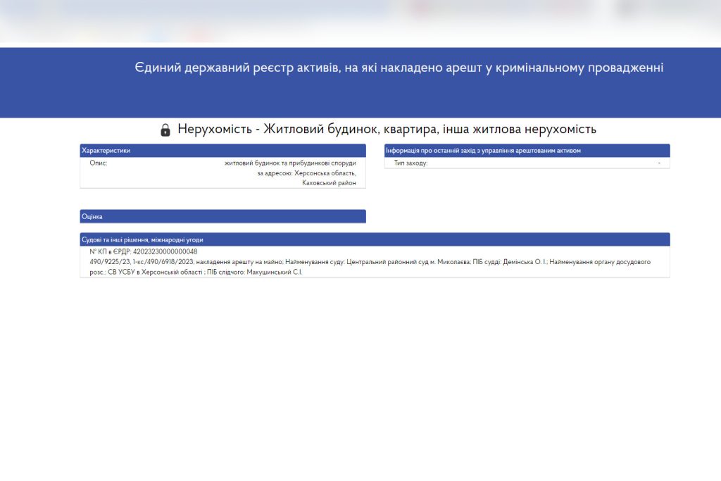 Про це свідчить інформація з Єдиного державного реєстру активів, на які накладено арешт у кримінальному провадженні.