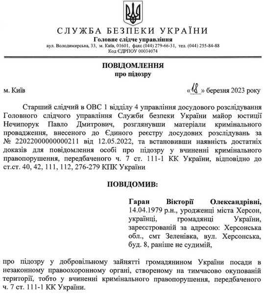 Гаран є фігуранткою кримінального провадження за номером з Реєстру.