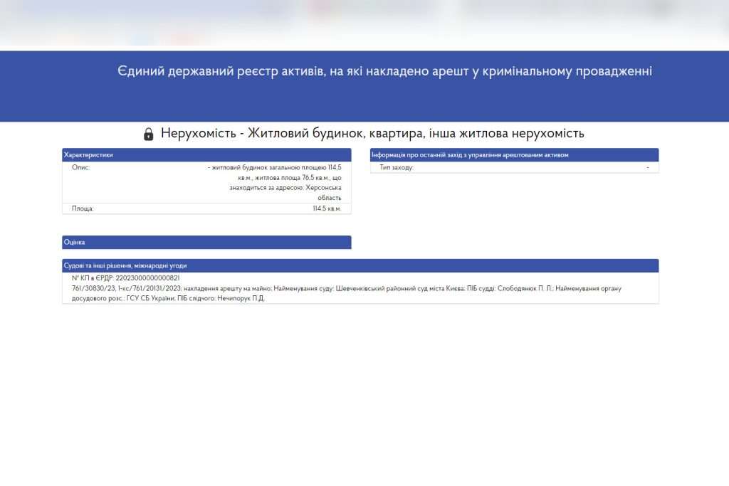 Про це свідчить інформація з Єдиного державного реєстру активів, на які накладено арешт у кримінальному провадженні.