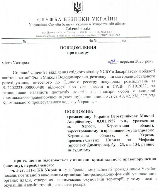 Миколі Веретеннікову інкримінували колабораціонізм. Він пішов на співпрацю з росіянами 20 серпня 2022 року.