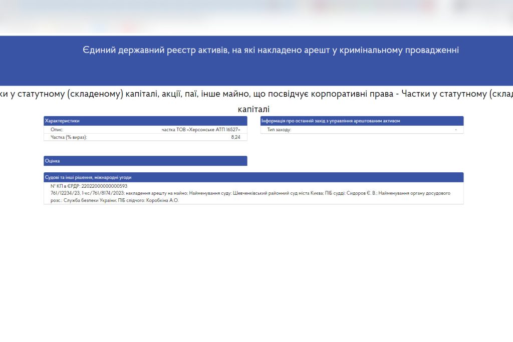 Про це свідчить інформація з Єдиного державного реєстру активів, на які накладено арешт у кримінальному провадженні.