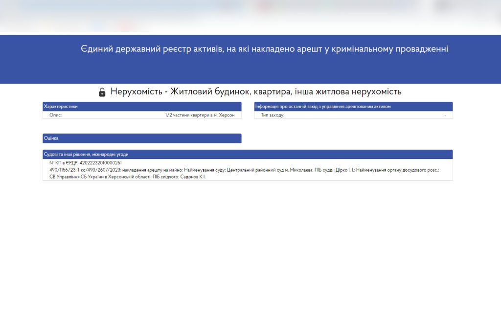 Про це свідчить інформація з Єдиного державного реєстру активів, на які накладено арешт у кримінальному провадженні.
