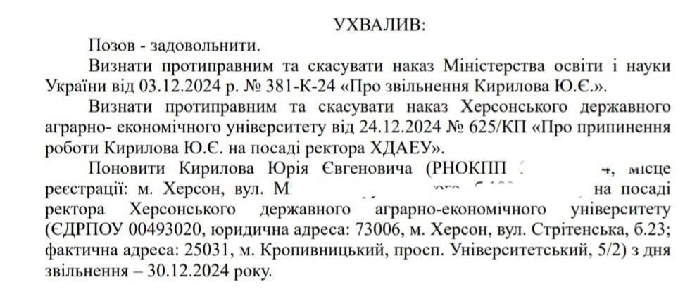 Юрія Кирилова, з яким міністр освіти та науки України достроково припинив контракт ректора Херсонського державного аграрно-економічного університету, поновлено на посаді, а сам наказ скасовано судом.Про це стало відомо з публікації у професійній групі «Новини вищої освіти» у Фейсбук, де розміщено фрагмент рішення суду.