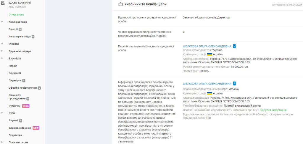Його засновницею і власницею є Ольга Шелєхова, яка у 2020 році працювала фінансисткою на “Сапфір-Агро”.