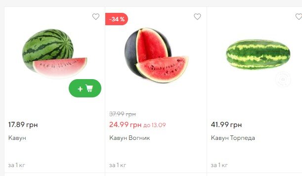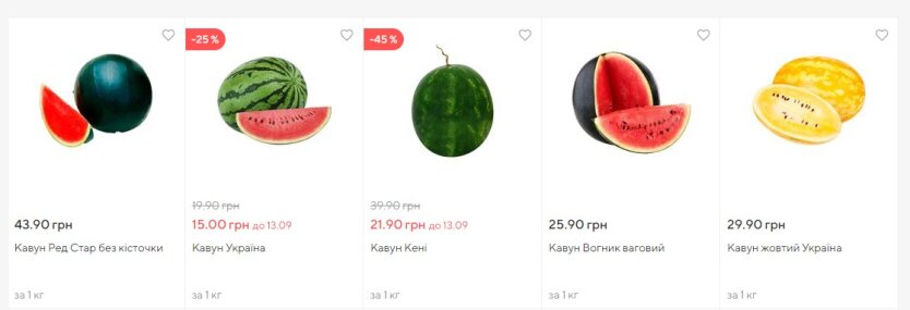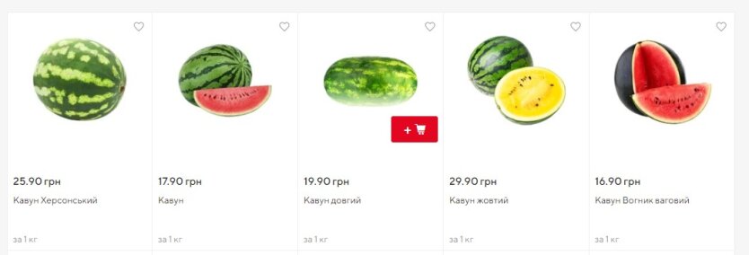 Так, станом на 9 вересня цінники на кавуни на полицях Ашан коливаються від 16,90 грн/кг до 47,70 грн/кг (без кісточок).