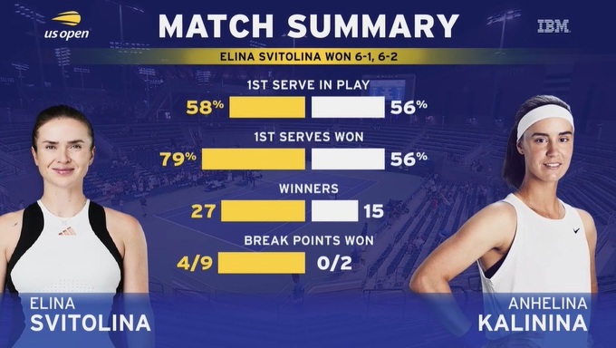 Це була 3-тя зустріч тенісисток, поки що перемагала тільки Світоліна. Найкраще досягнення Еліни на американському мейджорі – півфінал у 2019-му.
