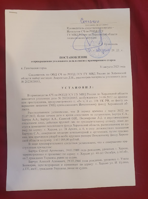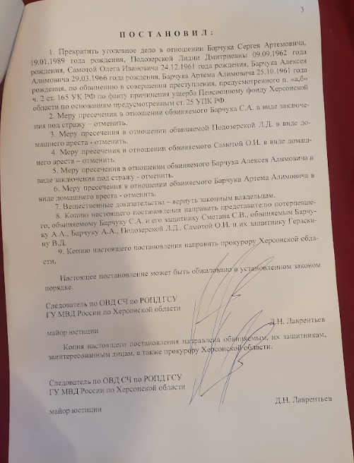 30 серпня 2023 року мене викликав до себе «слідчий», у якого вже був Сергій Барчук і спитав, чи хочемо ми завтра вийти на свободу і що у нас навіть не буде «судимості»? Звісно, хочемо. Він посадив нас до машини і привіз до дому, який зняла Наталка. Згодом туди під’їхав мій адвокат і адвокат Сергія, мені сказали підписати якийсь документ. Росіяни замінили нам статтю «обвинувачення» на якусь іншу і відтепер окупаційний пенсійний фонд не мав до нас жодних претензій. На наступний день нас відпустили.