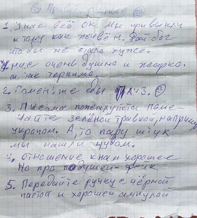 Олексій Барчук: У Каланчаку з чимось було трохи легше, а з чимось ще гірше. Головні відмінності – людей у камері там тримали більше. Іноді нас було по десять чоловік – у камері на двох. А ще там можна було спілкуватися. Часто у камеру садили місцевих, які розповідали нам якісь новини. Ми ж були повністю ізольовані від зовнішнього світу з 21 липня. І Наталка, моя дружина, іноді передавала нам із їжею записки. Довгий час ми їли тільки те, що вона нам передавала, бо росіяни нас взагалі не годували, давали лише кип’ячену воду.