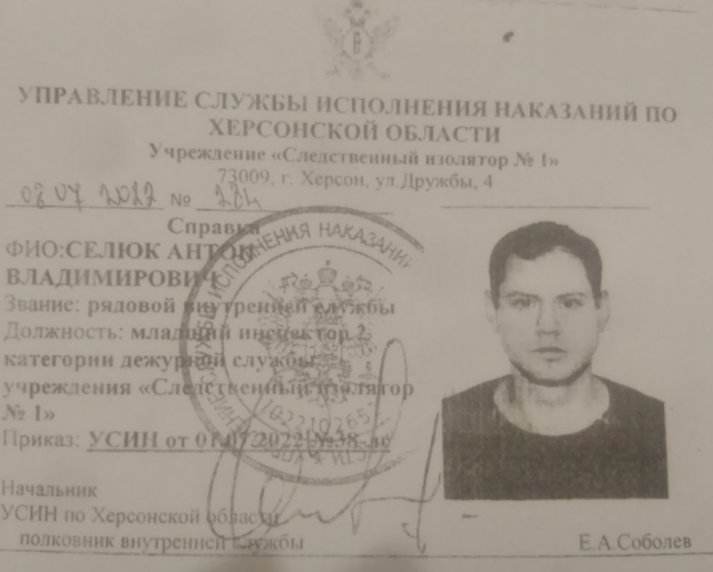 Начальником загону в ізоляторі Чонгара був колаборант Селюк Антон Володимирович, який працював у слідчому ізоляторі в Херсоні. Ще там був фельдшер з херсонського ізолятора, який у окупантів дослужився до посади «начальника медичної служби».