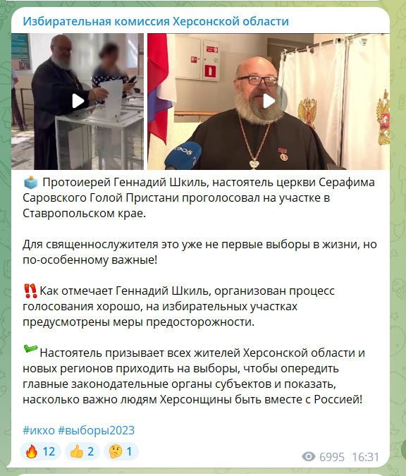 Telegram-канал окупаційної виборчої комісії Херсонської області розмістив проілюстроване відео повідомлення, де протоієрей Геннадій Шкіль хвалить окупантів за надану йому можливість проголосувати.