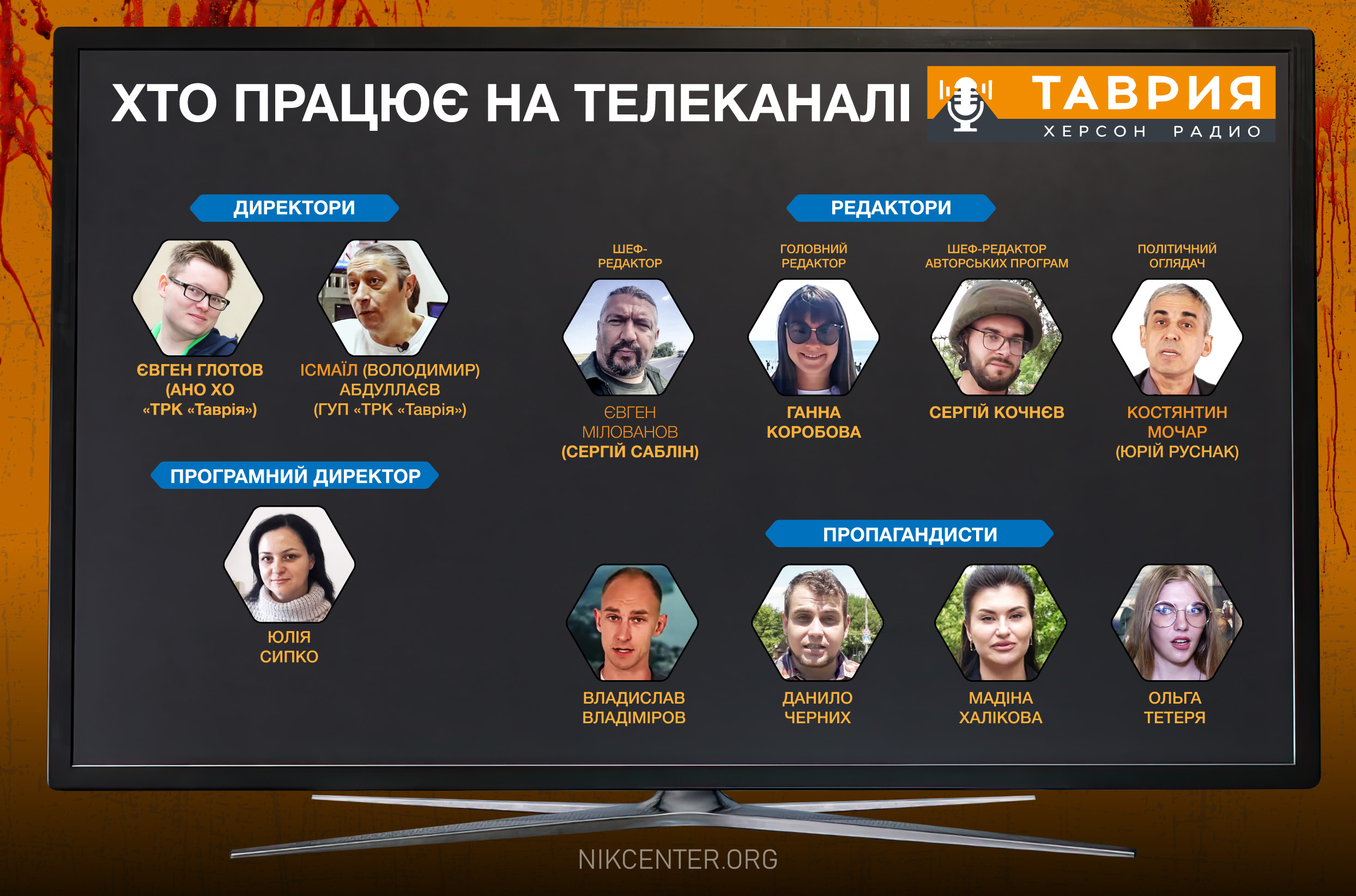 “Государственное унитарное предприятие “Херсонская областная телерадиокомпания “Таврия” возглавляет Исмаил Абдулаев. Директором “автономной некоммерческой организации Херсонской области “Телерадиокомпания “Таврия” значится Евгений Глотов.