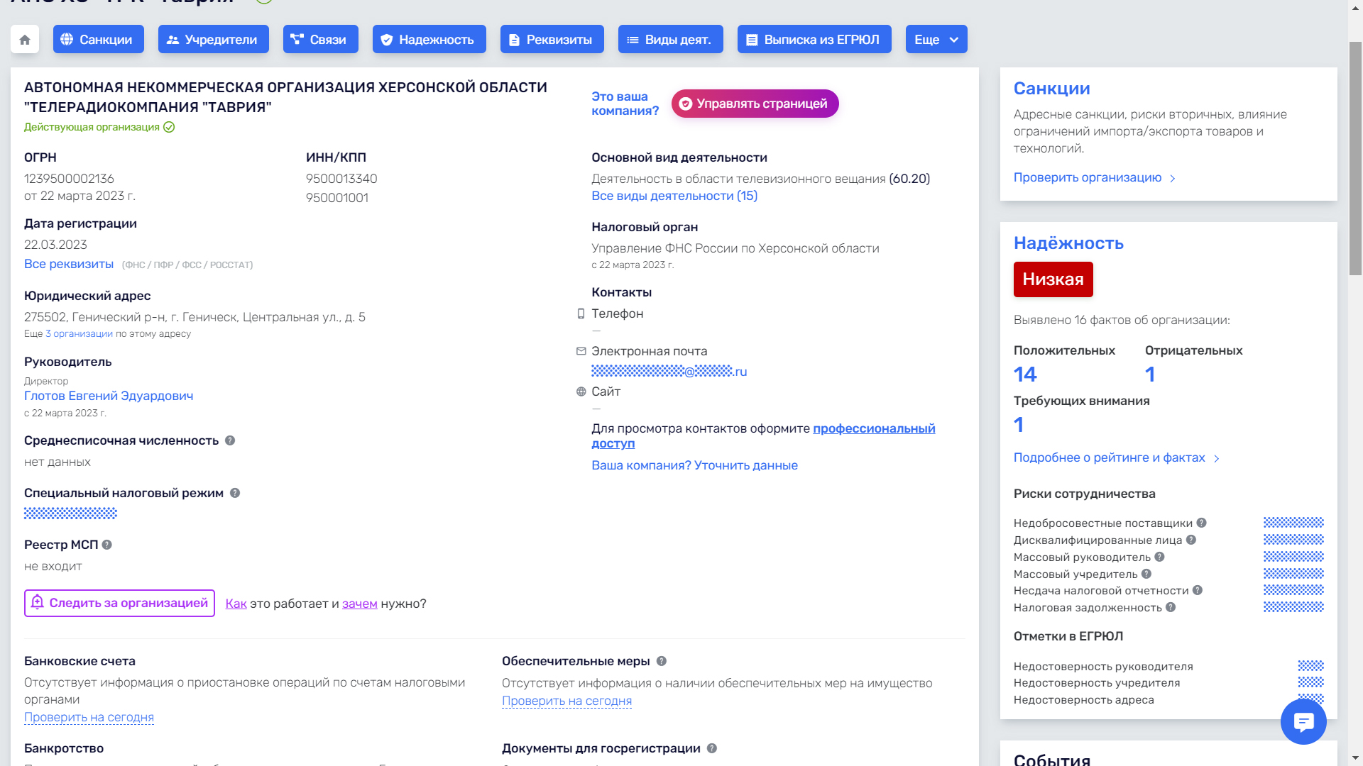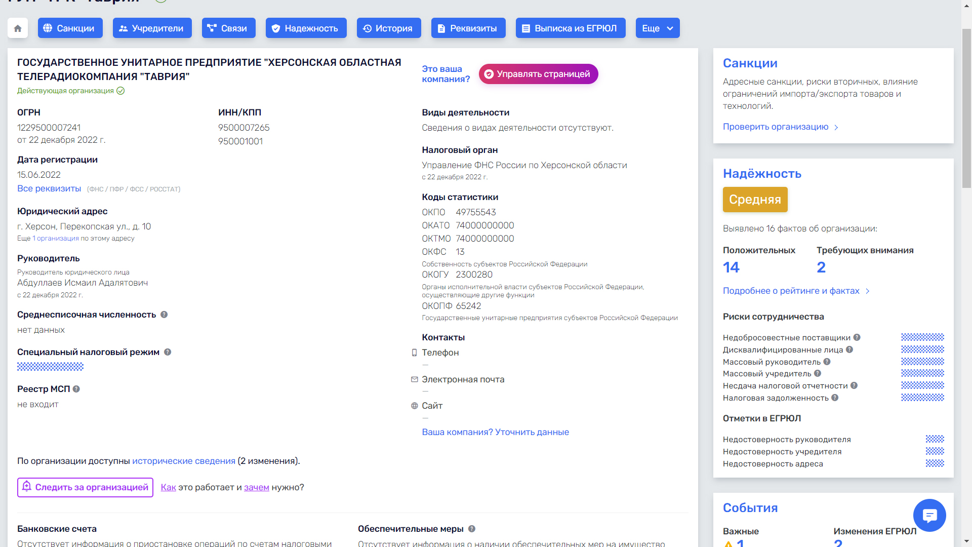 Согласно данным российского реестра юридических лиц, на временно оккупированной Херсонщине зарегистрированы две ТРК “Таврия”: “государственное унитарное предприятие”, зарегистрированное 15 июня 2022 года с юридическим адресом в Херсоне, и “автономная некоммерческая организация Херсонской области “Телерадиокомпания “Таврия”, зарегистрированная 22 марта 2023 года с юридическим адресом в городе Геническе.