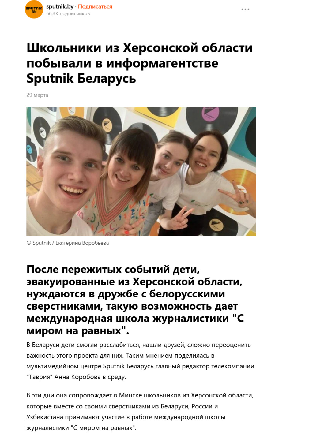 Продолжила она пропагандистскую работу и после побега на до сих пор оккупированную россиянами левобережную часть Херсонщины и в марте 2023 года сопровождала херсонских школьников во время поездки в Беларусь.