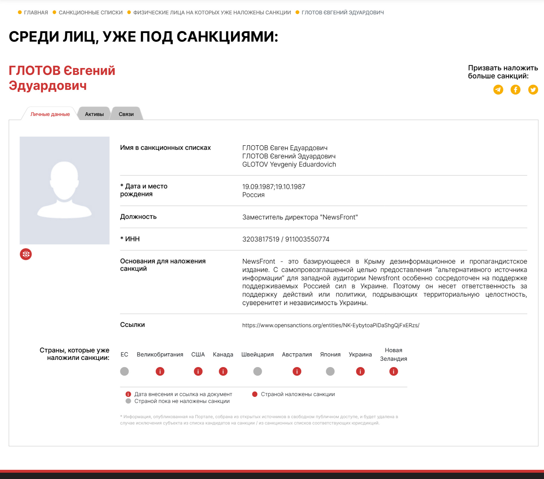 Глотов и Кнырик связаны не только через “NewsFront”. Они указаны среди учредителей ООО “Креативное агентство “Студмедиа”: Глотов – от создания в 2015 году, Кнырик вошел в состав учредителей в 2017-м. Также в 2019 году Глотов баллотировался на “выборах” в нелегитимный парламент Крыма от российской партии “Родина”, Крымское региональное отделение которой возглавляет Кнырик.