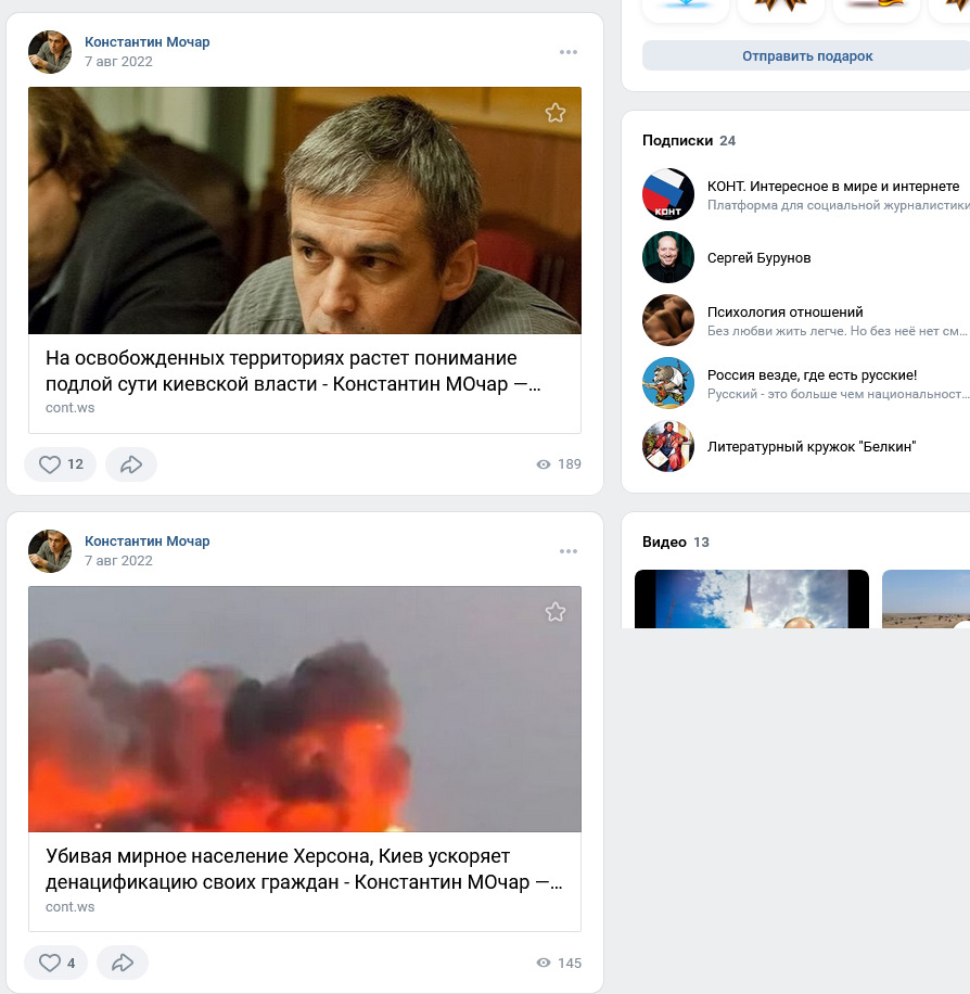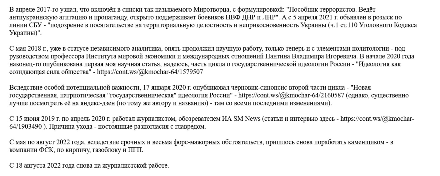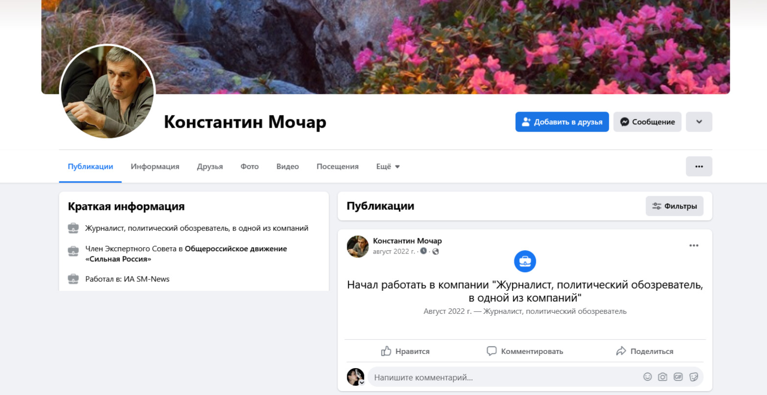 На ТРК “Таврия” Мочар, судя по его сообщениям в соцсетях и пабликах, начал работать 18 августа 2022 года. И там, где он фигурирует под настоящими именем и фамилией, пишет об этом событии, не называя место работы: “С 18 августа 2022 года снова на журналистской работе” или “Журналист, политический обозреватель в одной из компаний”.